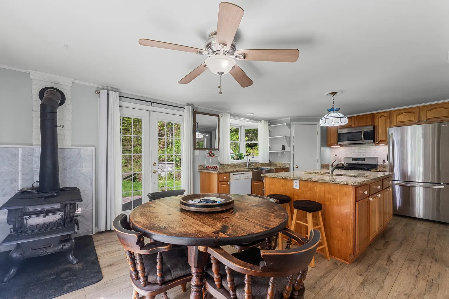 Luxury Vinyl Plank (LVP) flooring flows throughout the home, complemented by fresh paint and large windows that bring in natural light. The kitchen features granite countertops, a gas oven/range, and a Rinnai tankless water heater for efficiency. For cozy winter nights or off-grid cooking, there are two wood-burning stoves—one strictly wood, and one capable of burning both coal and wood.