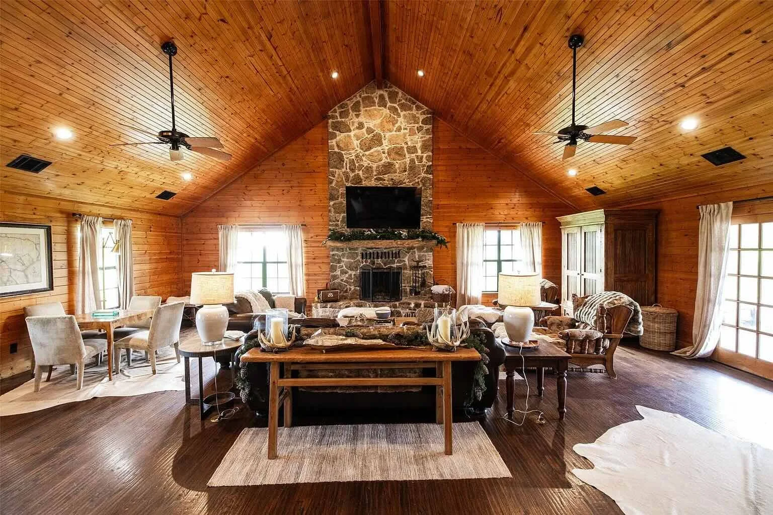 Built in 2002 with meticulous craftsmanship, the nearly 5,000-square-foot main home is packed with ranch-style charm. From the moment you walk in, you're greeted by a soaring vaulted ceiling, exposed wood beams, and a large stone fireplace that anchors the open-concept grand room. Natural light floods the space, making it feel airy and warm year-round.