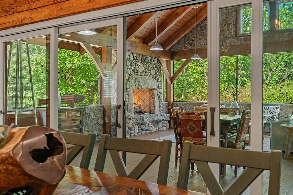 Inside, you’re greeted by a sun-drenched great room with soaring, wood-beamed ceilings, expansive windows, and a dramatic river stone fireplace that anchors the space. The lodge-style architecture is brought to life through artisan finishes such as antique beams, reclaimed barnwood, and wormy chestnut details that add warmth and history to the home.
