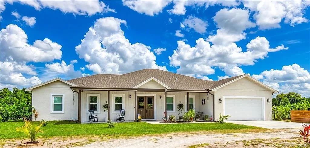 This new-construction modern farmhouse on 10.5 acres in Okeechobee offers luxury living, a 3-stall barn, and a full-size basketball court in a gated equestrian community.